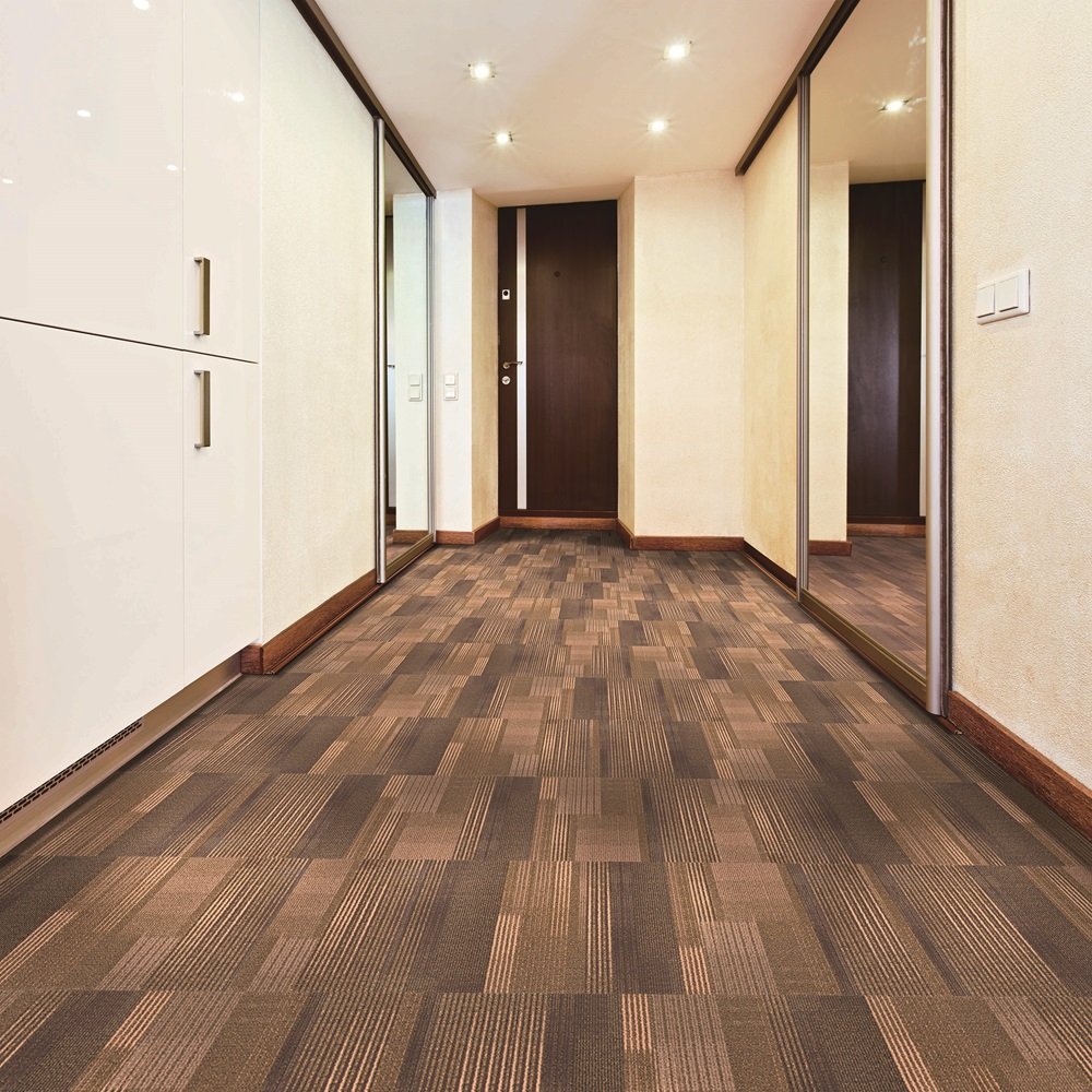 Nylon carpet tiles on PVC backing in geometric linear pattern