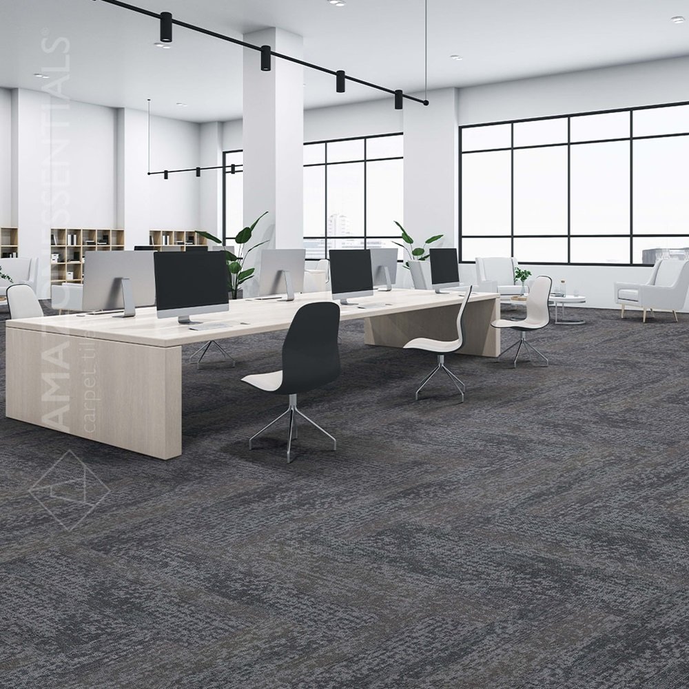 PP carpet tiles in plank format on bitumen backing in abstract motif