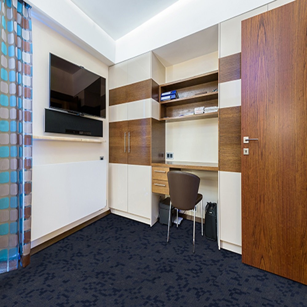 PP carpet tiles on bitumen backing in multi-level geometric pattern