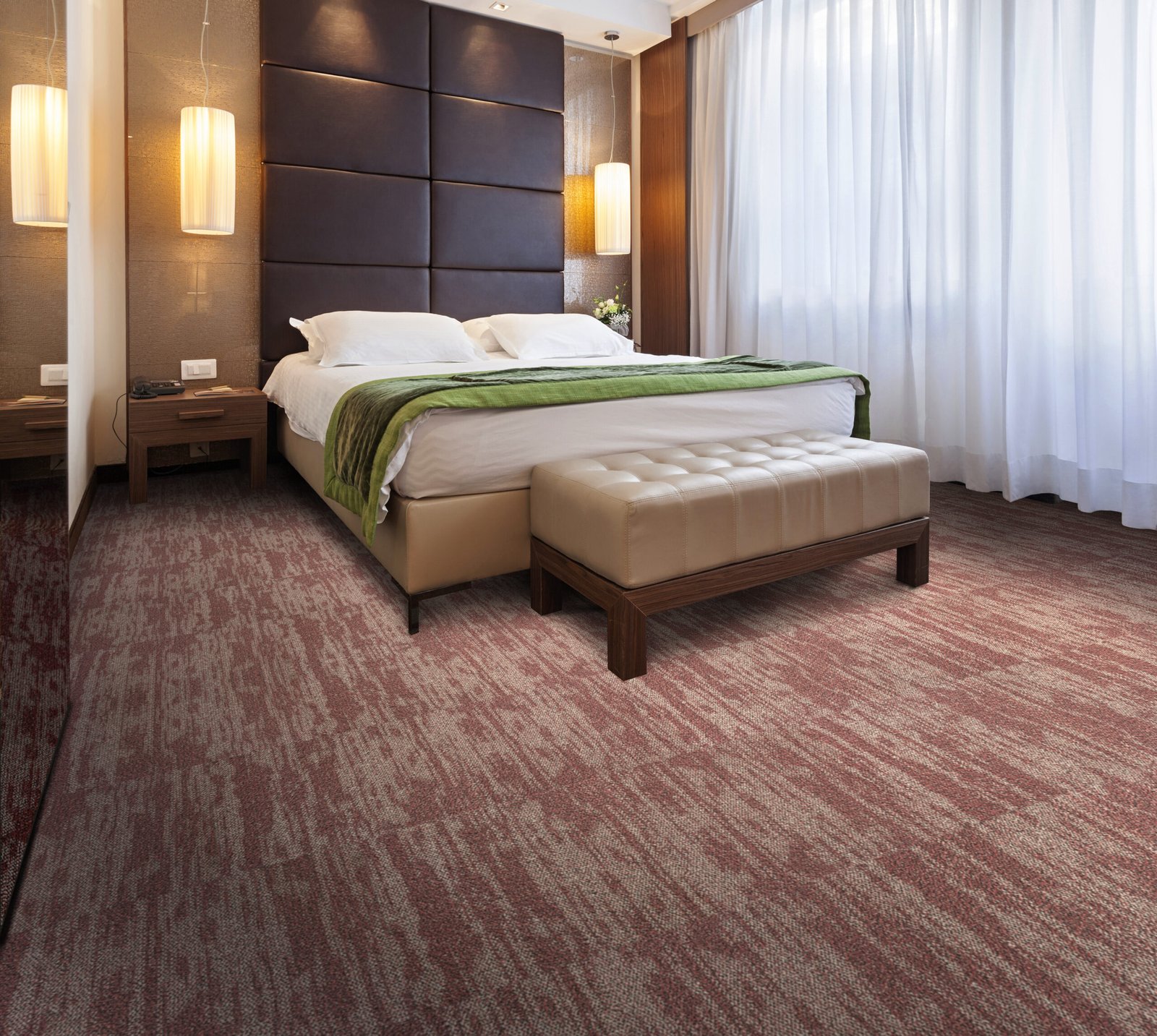 PP carpet tiles on PVC backing in geometric-abstract motif.