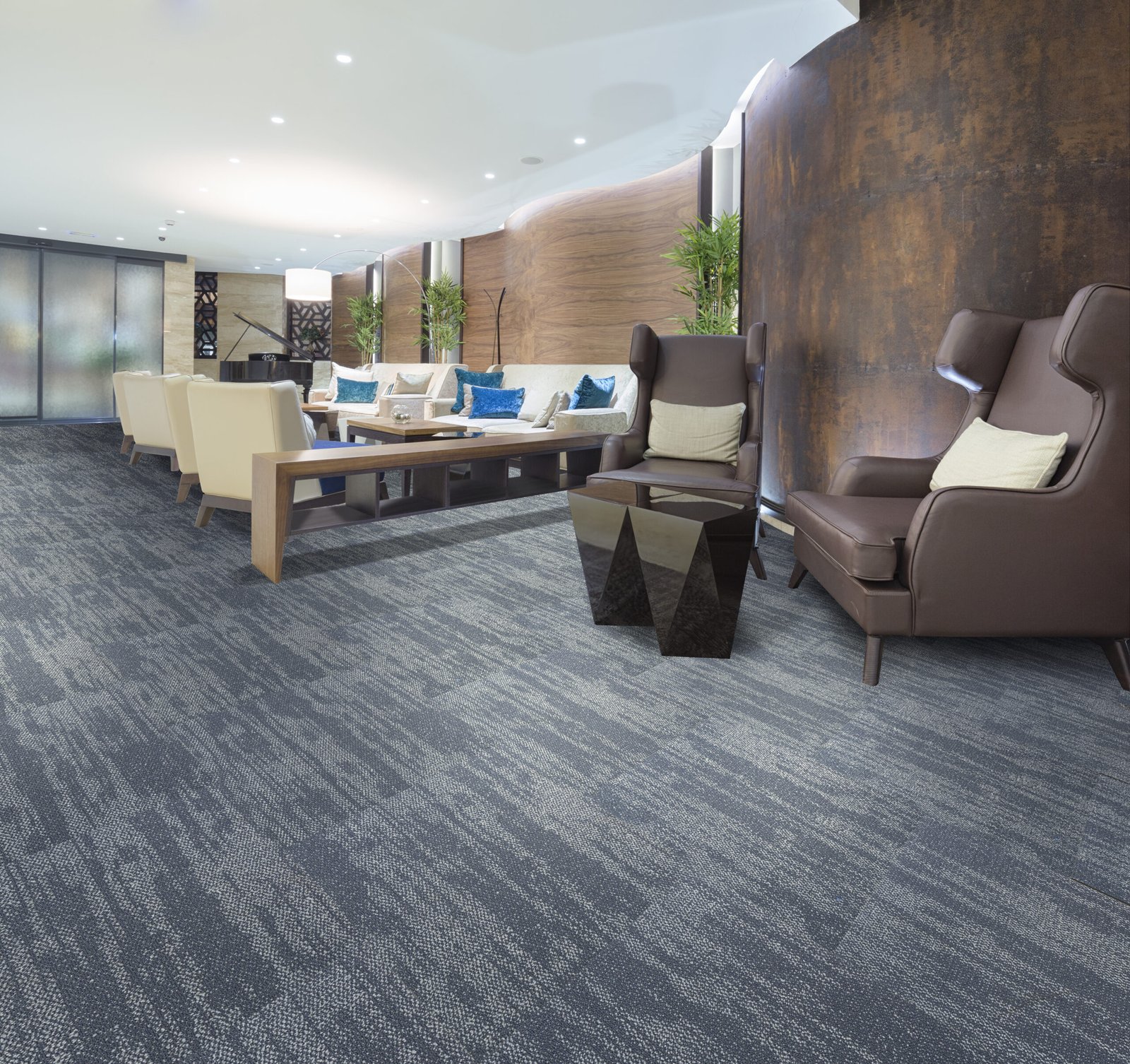 PP carpet tiles on PVC backing in geometric-abstract motif.